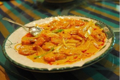 巴基斯坦红咖喱虾风味浓郁,鲜弹的大虾裹满醇厚的红咖喱酱汁,辣中带甜还透着淡淡的椰香,每一口都入味十足,搭配刚烤好、外皮微脆内里松软的黄油馕饼,用馕蘸着咖喱汁吃,满足感瞬间爆棚。